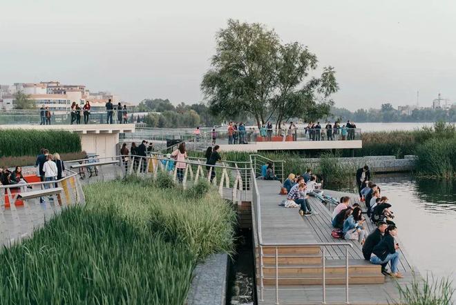 俄罗斯喀山市卡班湖群滨水区景观复兴为跨国实践项目,针对卡班湖群的水质恶化与生态退化问题,通过湿地修复、植被重建与滨水步道设计,恢复了湖泊生态功能,同时打造了融合鞑靼文化元素的公共空间,成为国际生态合作的典范。