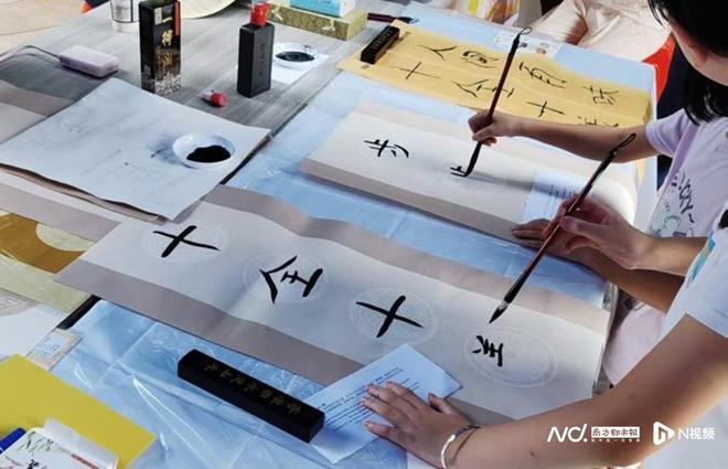书法体验区翰墨飘香。实践团成员以外语耐心讲解握笔、运笔的基本方法,引导外籍参与者蘸墨挥毫。不少参与者专注练习,亲身感受中国书法的线条之美和气韵之妙,并表示借这种特别的体验对中国书法有了全新认识。许多参与者还将自己的书法"首秀"作品带回家中珍藏。