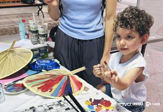 只见参与者以传统蒲扇为画布,用水彩、国画颜料或马克笔描绘夏日风情、花鸟鱼虫、诗词意境或个性图案。一对夫妇精心绘制了荷花与鲤鱼图案,象征“年年有余”的美好寓意;外籍小朋友则在志愿者指导下,完成了带有熊猫图案的创意蒲扇。轻摇之间,清风徐来,东方美学与创意艺术在此交融。
