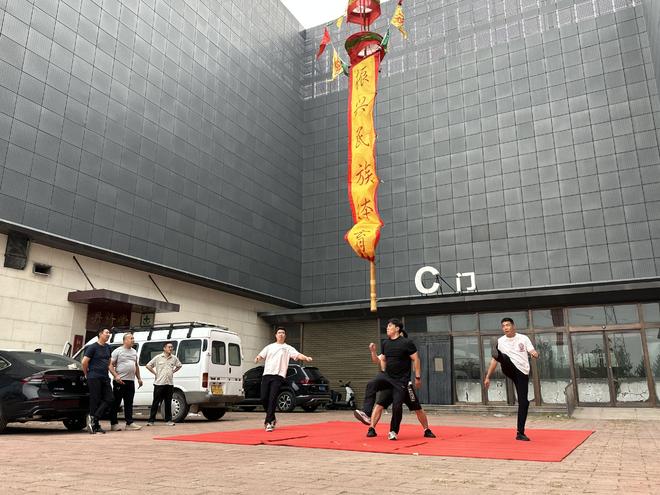 9月21日下午,南四环南苑附近的一处室外停车场,“常氏中幡”进行每周一次的例行训练,铺上几块毡子就是一片简易的训练场。张亮、常泽等人正跟着大师兄王鹏一起训练,备战京津冀民族传统大会。张亮是常全东的外甥,常泽是常全东的侄子。