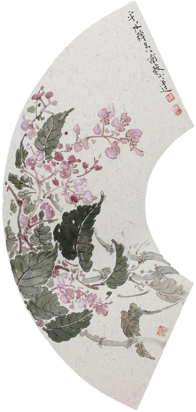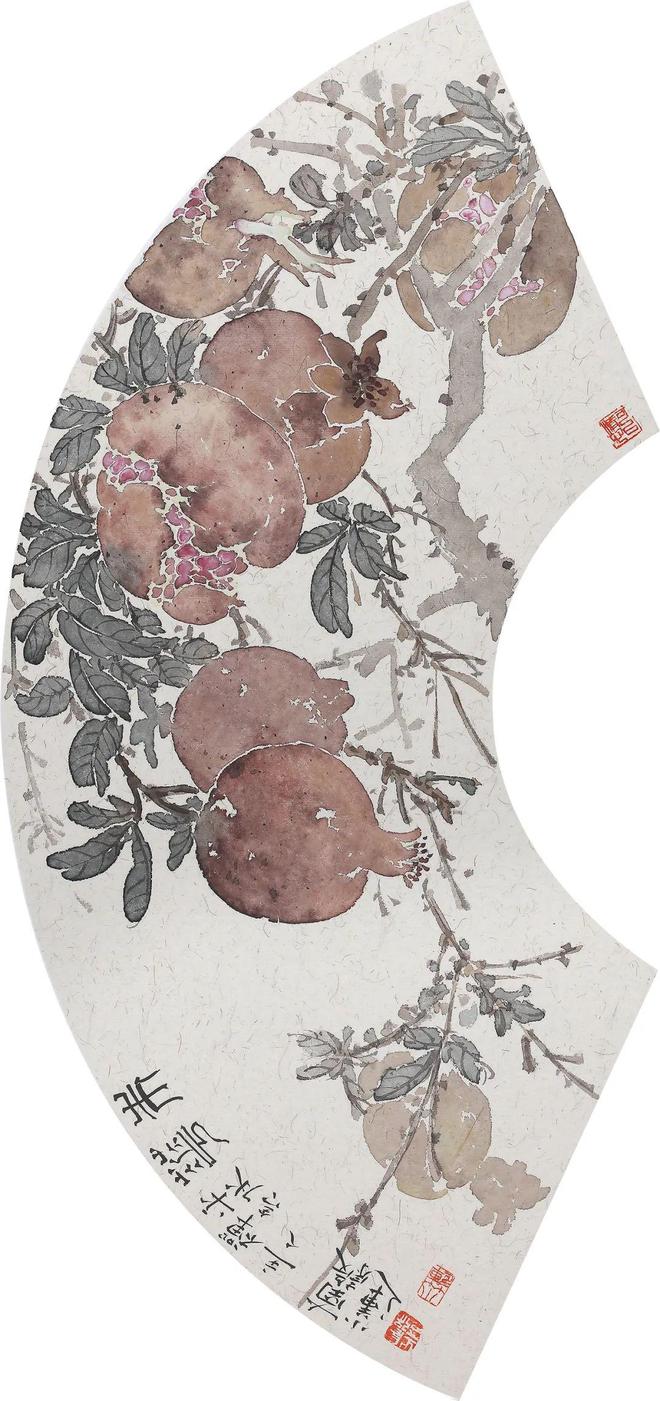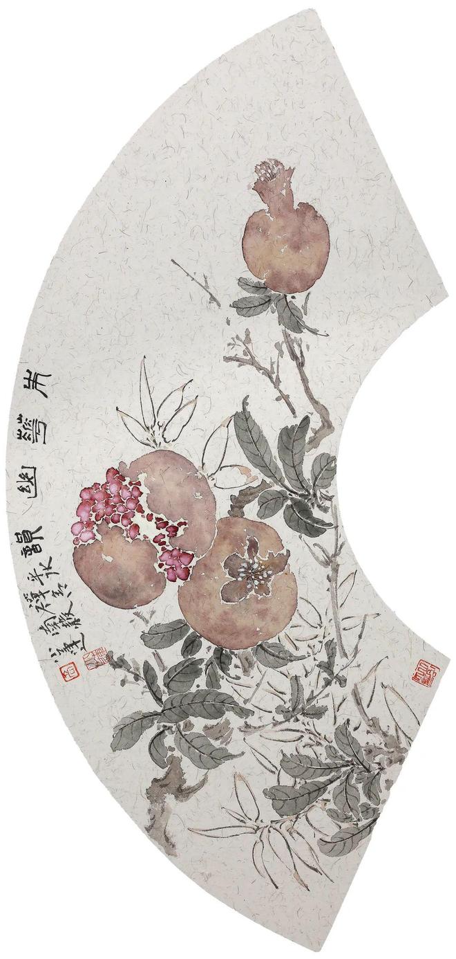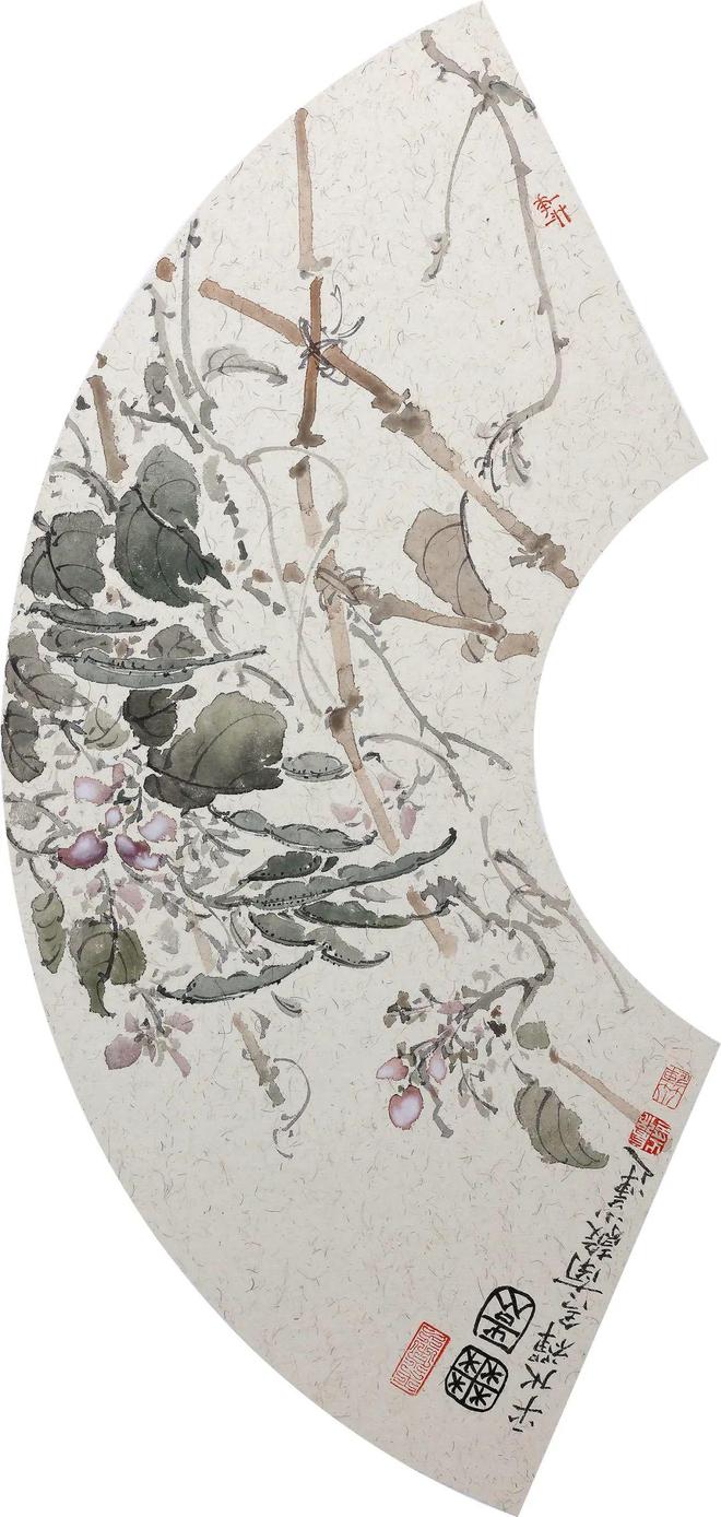 高强(南榖小莲)的扇面取传统没骨法,色墨在隐现间晕染如呼吸,既承宋元意趣、明清朴拙,又脱却俗气火气,自见雅朴清气。笔下石榴、山茶、扁豆皆成诗——墨色浓淡藏着“意贵乎远”的清简,花果鲜活处似与自然坦诚对话,将市井蔬果点化为“繁华中见超脱”的文人闲趣。这组扇面每一幅于笔墨中透出“静气成画”的诗篇。