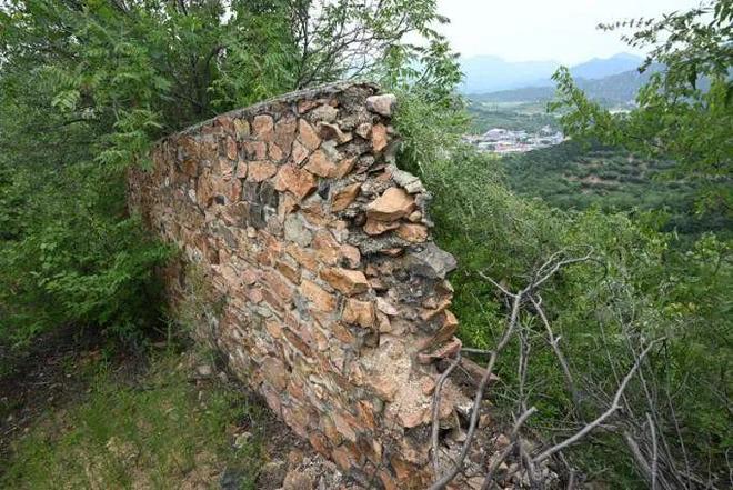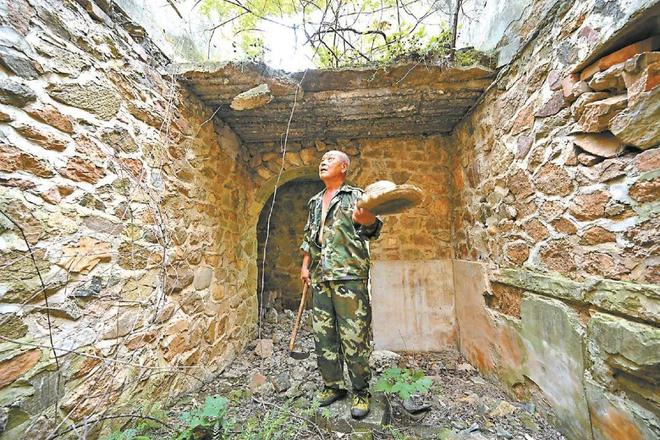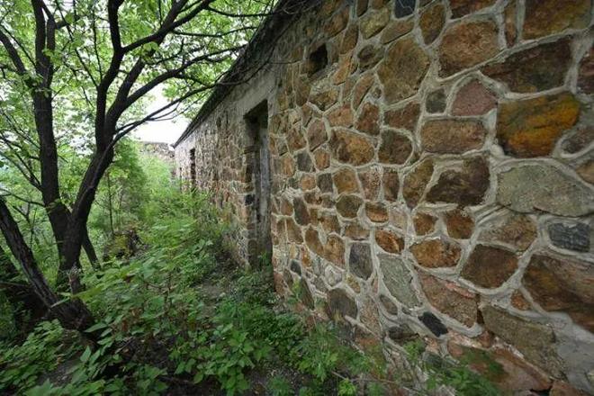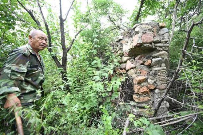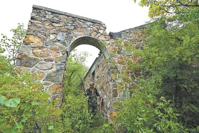 离开人字形营房,北青报记者沿山坡向东步入一块台地,这里的房屋更显颓败,残墙内外种满庄稼和果树。就当北青报记者以为兵营规模不过如此时,齐春福将记者引向南山的更高处。穿过一片栗树林,北青报记者来到半山腰,又见到依山而建的石头房子,同样是断壁残垣、不避风雨,在一堵高约两米的残墙前,齐春福停下脚步说:“这就是日本人留下的炮楼,过去应该是两层,根据残存的环形房基判断,炮楼为圆柱形。”