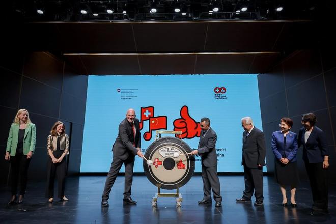 人民网北京9月15日电 (周锦佳)9月14日,为庆祝中国与瑞士建交75周年,瑞士驻华大使馆携手北京市文联老舍剧场共同举办音乐会。中国政府欧洲事务特别代表卢沙野与瑞士驻华大使白瑞谊(Jürg Burri)出席,并在演出开始前共同敲响象征中瑞友谊的铜锣。