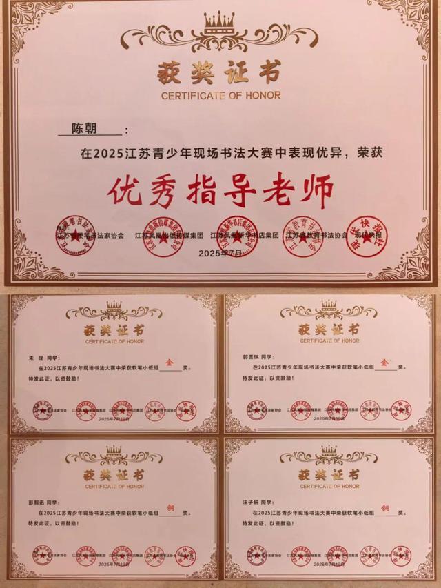技艺彰显:学员在江苏省及全国青少年书法赛事中屡获金、银奖项,书法考级通过率持续领先,多幅作品入选文化展览。