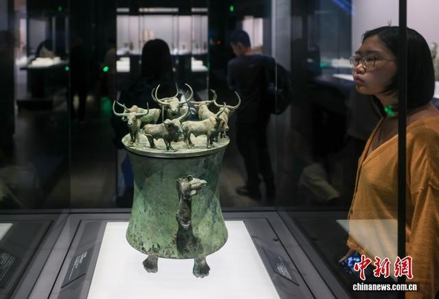 中新社记者 贾天勇 摄 10月13日,上海博物馆(东馆)内展出的西汉青铜器——八牛贮贝器吸引观众。