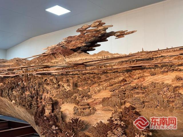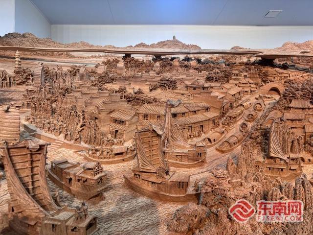 据介绍,木雕作品《京杭大运河》全长120米,2023年3月27日正式开工,计划于2027年年底完工。作品以中国山水画长卷形式再现京杭大运河漕运盛景与沿岸人文底蕴,分为北方卷、中卷与江南卷三卷,展示中华历史之美、山河之美、文化之美。目前,整个作品之中的江南卷已完工,于9月28日正式向公众开放,市民群众可前往莆田市美术馆观看,