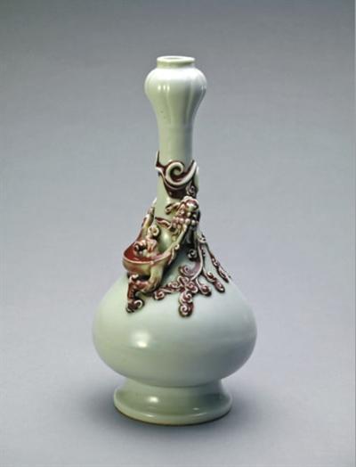 白釉塑贴鲜红蟠螭蒜头瓶 明嘉靖