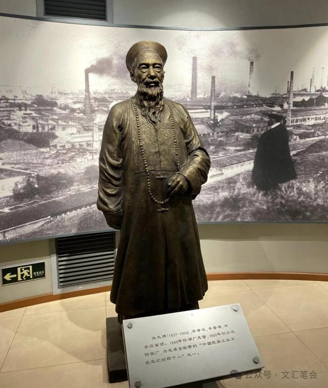 从钢迁会展厅转过拐角,一尊张之洞的铜像在暮色般的灯光里沉默伫立(下图)。他身后的展墙上,“汉阳铁厂”四个鎏金大字被水汽晕染得有些模糊,仿佛刚从1890年的长江雾色中浮现。玻璃柜里陈列着一块锈迹斑斑的钢轨,标签上写着“1893年,汉阳铁厂第一批钢轨”,指尖轻触玻璃,似乎还能摸到一百三十年前的温度。