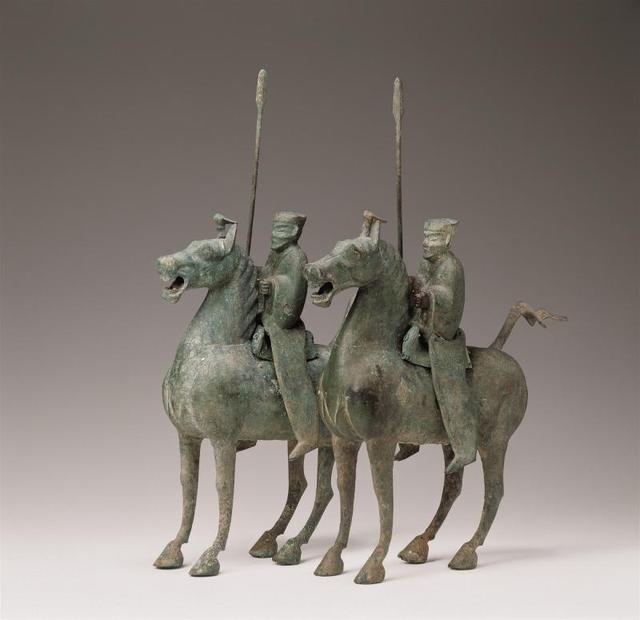 本次展览的展品多是精挑细选,像瀚海西风单元展出的铜车马仪仗俑队,出土于甘肃武威雷台汉墓,共99件,是迄今发现数量最多、阵容最雄伟的同类文物。整个仪仗俑队中最核心的马俑,便是被称为“马踏飞燕”、著名的铜奔马。本次展出的是其中的8组24件,分别为最前方持矛及持戟的骑士,后方的从骑、带伞的轺车,以及有配有奴婢俑的輂车。展品再现了汉代高级官员出行的威仪,精细还原了汉代的车马制度,是汉朝经营西域,守卫丝路贸易,以及传播中土文明的缩影。本品制作精良,体现了汉代高超的铜冶工艺。