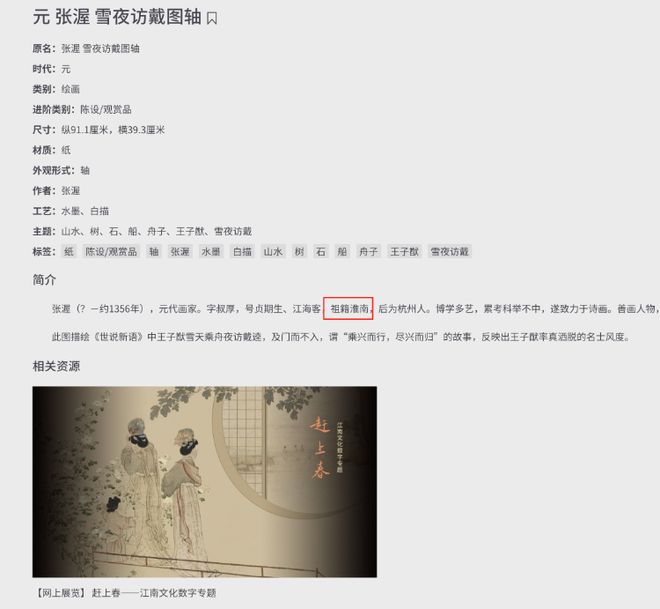 记者检索发现,在上海博物馆官网上,有张渥两幅作品,其中“兰陵笑笑生”提到的《九歌图卷》下的作者简介,的确写着“祖籍江苏淮南”;不过在另一幅作品《雪夜访戴图轴》下,作者简介则没有“江苏淮南”的说法,而是“祖籍淮南,后为杭州人”的表述。随后,记者又查询了同样有张渥作品的吉林省博物院,张渥的简介为“张渥,字叔厚,号贞期生,淮南人”。