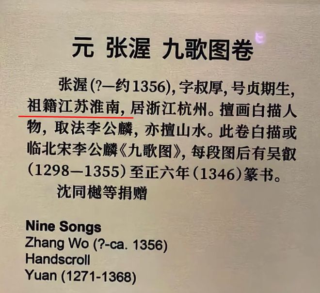 近日,江苏网友“兰陵笑笑生”发帖,对上海博物馆内元代著名山水画家张渥的人物简介提出质疑。其发布的线下展馆图片显示,在张渥的《九歌图卷》下,作者简介这样写道,“张渥(?—约1356),字叔厚,号贞期生,祖籍江苏淮南,居浙江杭州。”“兰陵笑笑生”认为,“江苏淮南”的表述疑似有误。如果博物馆写的是古代地名,古代没有江苏说法;如果是现代地名,江苏没有淮南。