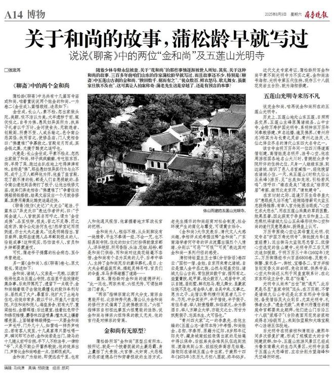 随着少林寺释永信被查,关于“花和尚”的那些事情逐渐被世人所知。其实,关于这种和尚的故事,三百多年前咱们山东的作家蒲松龄早就写过,而且故事还不少。特别是《聊斋》中五莲山古刹的金和尚,“腴田数千,据而有之”,“徒众数百,鲜衣怒马,歌儿舞女,虽豪家仕族不及也”。这可真让人拍案称奇:蒲老先生这是穿越了,还是有预言的本事?