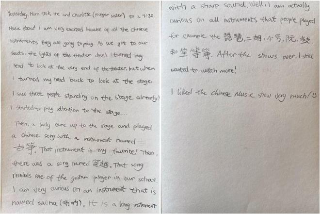 美籍华人小朋友Chloe Wang寄来用铅笔手写的英文信,表达了初识国乐的惊喜:“我对所有乐器都充满好奇,以后一定要多来看。”