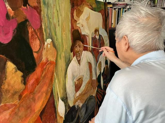 虽然天气炎热,但他还是坚持到画室工作,为的是修复两幅旧作。那是他年轻时去西藏与内蒙古采风后创作的大画——现代意味的构图、鲜活明亮的色彩,映照出创作者内心炙热的情感,尽管他的外表看起来是那样淡然。