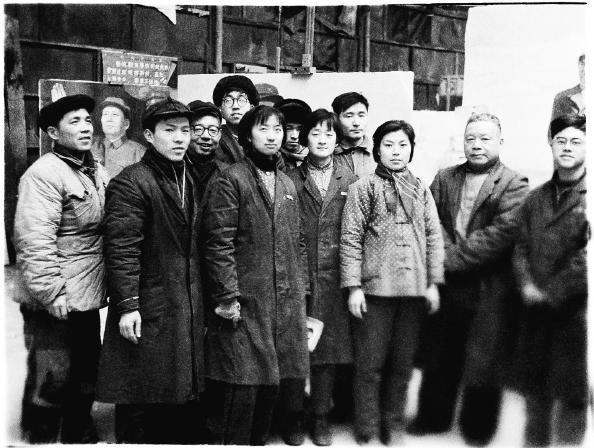 上海油画雕塑创作室部分人员在文化广场留影,左起:富华、邵隆海、俞云阶、陈逸飞、刘耀真、魏景山、程偕华、朱广发、朱德真、周碧初、邱瑞敏。