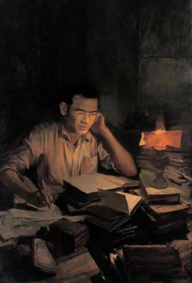 魏景山:当时我找了一位模特,他的外形和陈景润有点神似,也剃了个平头。我还到上海图书馆借了一些和数学有关的书籍,在画室里精心布置了他伏案工作的环境。然后关闭灯光,点起油灯,就对着眼前的场景写生。