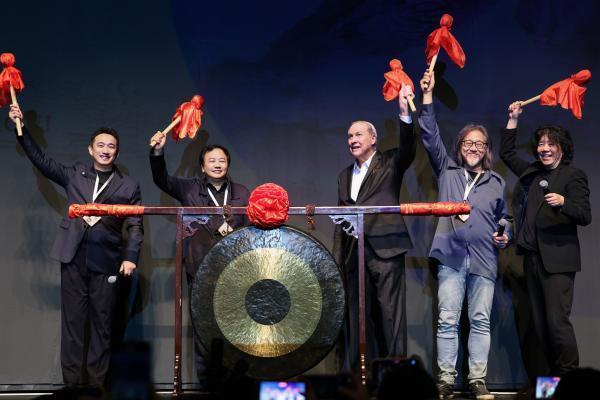 罗伯特·威尔逊(左三)和陈向宏、黄磊、赖声川、孟京辉一起敲响第十届乌镇戏剧节开幕大锣