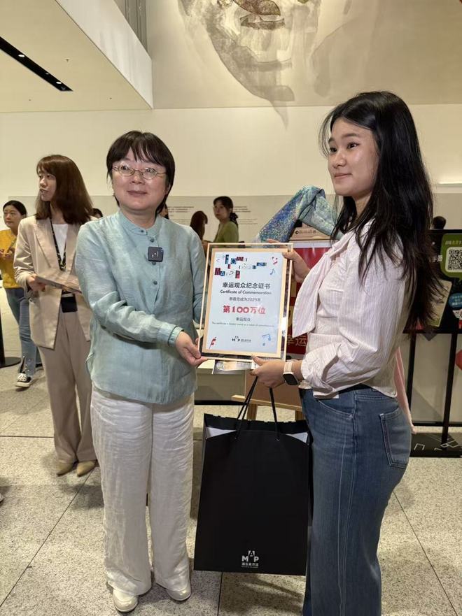 10月1日,上海浦东美术馆迎来了2025年第100万名幸运观众,这也是浦东美术馆首次一年观众破百万人次。这名幸运观众为来自深圳宝安的王佩玮,浦东美术馆馆长李旻坤为她送上了纪念证书。