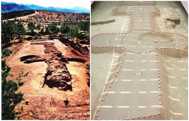考古发掘证明,红山先民依托山势,以土、石垫平地势低洼处,形成北高南低、中间高两侧低的雄伟台基建筑群,铺开可开展大型祭祀活动的平整空间。以女神庙北延线和通道为轴线,台基建筑呈对称式分布,这是目前已发现的年代最早的中轴对称布局建筑群。
