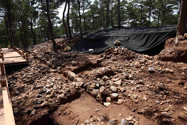 距离第一地点(女神庙)保护展示馆不足百米处,有一片郁郁葱葱的油松林,其间散布着十几个深浅不一的探方。遮阳网在烈日下投下斑驳阴影,20多位工人正用铲子和刷子细细清理表土。他们脚下约6万平方米的土地,曾是红山文化的祭祀中心;远处未发掘的山坡上,野草间还藏着古人运石的路径。