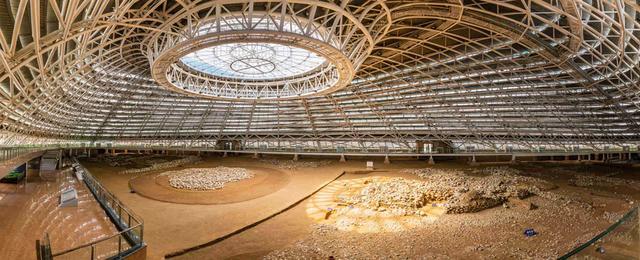 近年来的考古发掘确认,牛河梁遗址第一地点是由9座台基构成的大型台基建筑群,女神庙就坐落在9号台基上,这是目前中国发现的最早的宗庙。现今,第一地点(女神庙)保护展示馆位于牛河梁主梁顶部南坡,设计理念为“悬浮的玉匣”。走进展示馆二楼,可以俯瞰女神庙遗址全景——主室右侧标记处就是女神头像的出土位置。这处半地穴式土木结构建筑,南北最长22米,东西最窄处2米、最宽处9米,现已进行回填覆土保护。