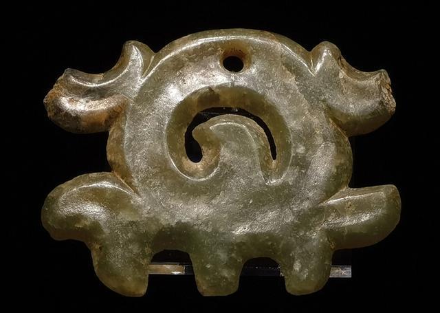 勾云形玉器:此类器物是红山文化代表性玉器之一,通常出土于等级较高的中心大墓内,并置于墓主人的身体关键部位。器型呈长方形片状,一般中心镂雕成勾云形盘卷,四角卷勾,周边较薄似刃状。