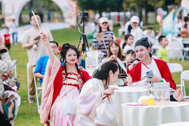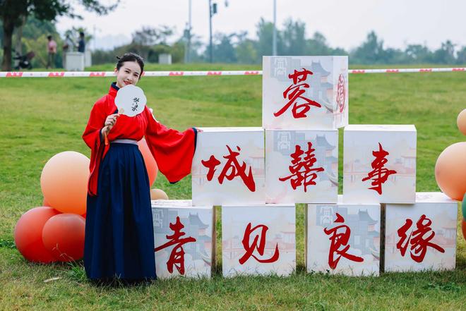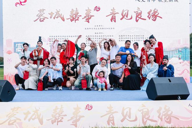 10月8日下午,成都国际非物质文化遗产博览园时空韵律音乐草坪洋溢着浓郁的古典浪漫气息。由成都市青羊区文化体育和旅游局主办,联合区内多家单位共同打造的“蓉城囍事·青见良缘”主题文化活动在此隆重举行。70余对情侣与夫妻齐聚于此,共赴一场以非遗为媒、以爱情为引的沉浸式中式文化体验。