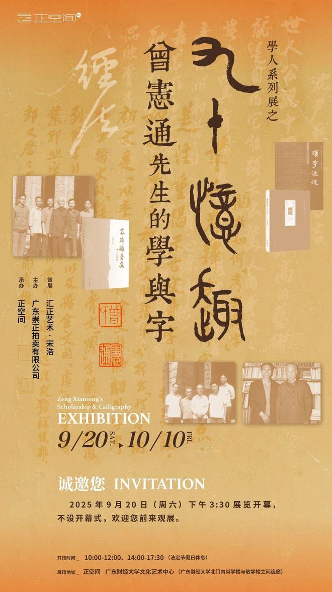 “九十忆趣——曾宪通先生的学与字”展览于2025年9月20日在广东财经大学文化艺术中心“正空间”开幕。本次展览集中展现曾宪通先生的学术成就与书法造诣,包括学术著作、书信、手稿及书法作品(条幅、对联、斗方等一百多件)。曾宪通先生长期致力于学术史研究,曾任中山大学中文系主任、人文学院院长,其书法浑厚质朴,饶有古意,尤其是楚帛书和楚简书写形神兼备,充分体现学者书法的古雅典重与理趣交融。展览亦呈现其学术史视野与个人幽默,值得细品。