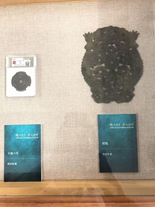 艺术品专场上展出的郭剑亮收藏的“大康六年”古钱(左)和任双伟收藏的宫钱(右)。