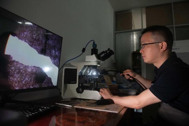 6月4日,在安徽省图书馆内,古籍修复师臧春华在使用专业仪器查看纸张纤维。