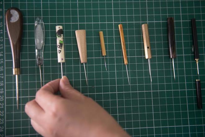 6月4日,在安徽省图书馆内,古籍修复师耿宁在介绍古籍修复所需使用的工具。
