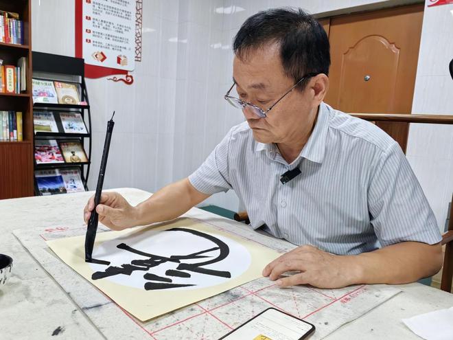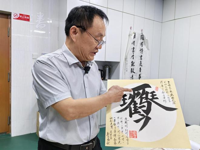 书法桌前,郭书雷伏案凝神,手中毛笔行云流水,笔锋腾挪间,“枕”“戈”“待”“旦”四个字的笔画相互借让、巧妙融合,一个饱满的合体字跃然纸上,落落大方。