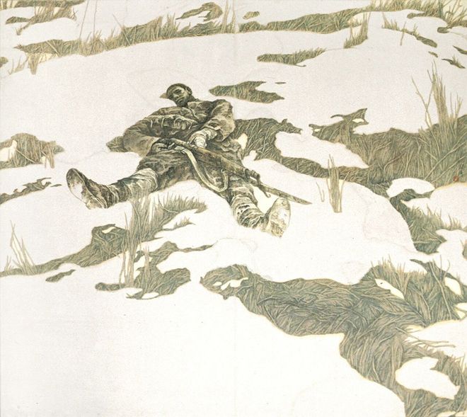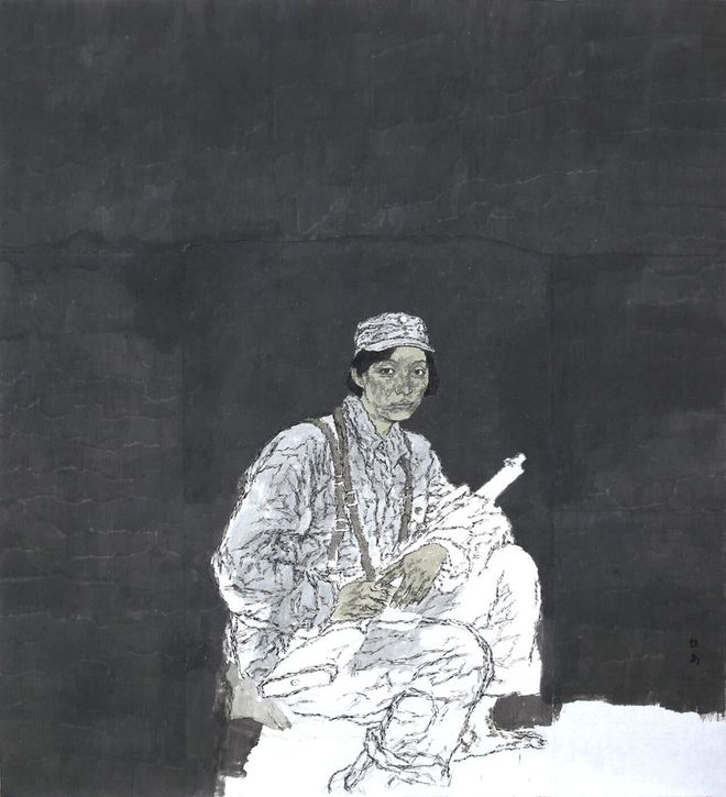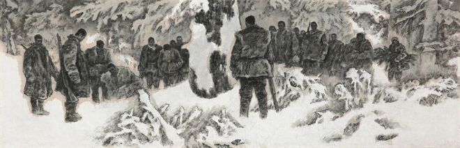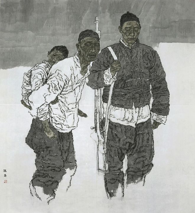 “时代回响”篇章展出的是赵奇在新世纪以来创作的大幅中国画作品。这些作品没有直接描绘激烈的战争场面,而是把目光投向了战场之外。如暗夜中拿起枪的女战士、城墙废墟前守望光明的男童、站在村口向远方眺望的母亲、倒在草丛雪地中仍然手握步枪的战士……在这些大幅作品中,艺术家以更加宏阔的视野和象征性的手法,用无声之诗勾勒出抗战洪流中一个个无名英雄的形象,展现其情感与命运,引发观者对战争与和平的深刻沉思,体现出一位知识分子型艺术家对民族历史的责任与担当。