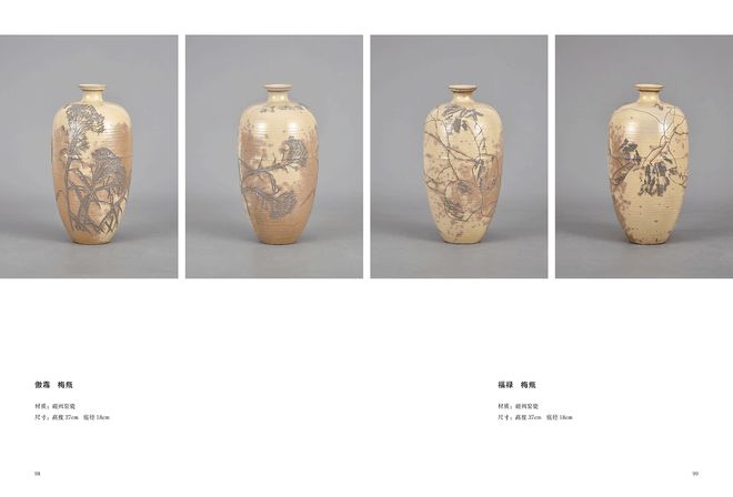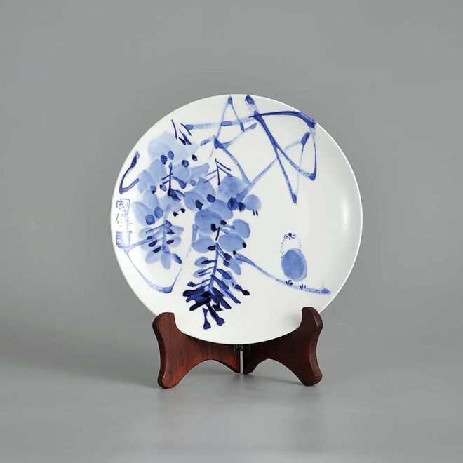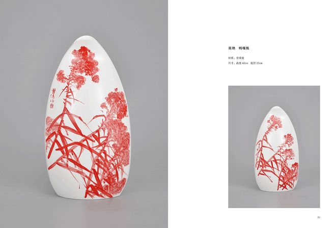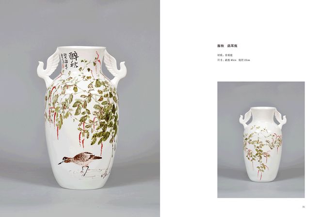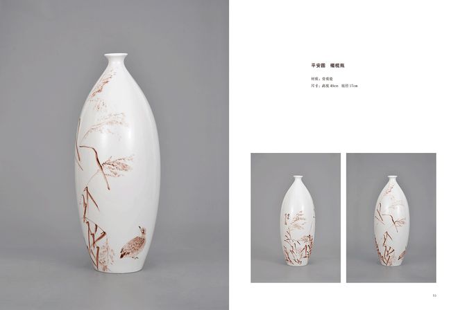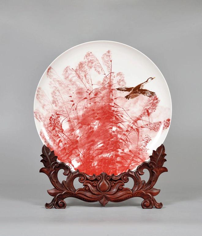 在他笔下,任何花鸟都能跃然瓷上,神采灵动,栩栩如生。那花、那叶,层次丰富,或可见疾风吹拂之感,或可感柔风拂过之味。那鸟儿、那雁,绒毛细密柔和,纤毫毕露,质感满满,每一处细节都被他精细描绘得丝丝入扣,足见其深厚的艺术修养和高超的绘制技巧。无论在何种器皿上,他都善于因材施艺地化“谋略”于无形,使得每幅画作都能与瓷器本身自成一体,浑然天成,且构图稳健饱满,疏密有致,形态精简而意远,浓、重、焦、淡墨相渗叠,线条中彰显出笔法的凝练和沉健。他的作品寓意也颇有超凡脱俗之感,传递出生生不息之美,可谓“质精色良艺美”,让人一眼看去便能感受到他作品的神韵所在。