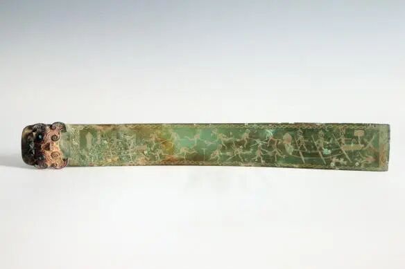 青铜质。锈绿。柶呈弯曲的长薄板形,端饰兽首。器表阴线刻划水战图,画面中央刻6组人物于水面兵戎相接的图景,左右各有1艘船,船上3人站立划桨,部分人物腰佩剑,其中右侧船尾放置头颅,水面尸体漂浮。画面外框上下装饰绹索纹,左右为多重菱格纹。