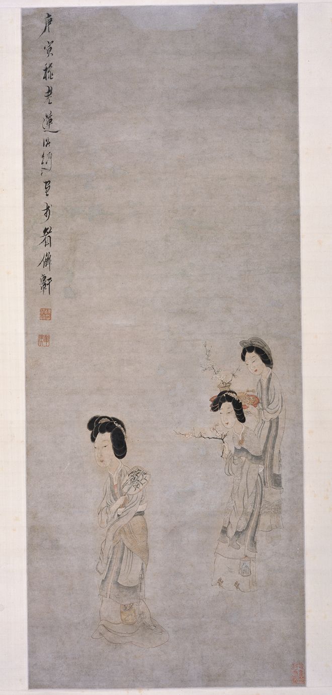 陈洪绶,明代书画名家,曾住在吴山火德庙。图绘三位仕女漫步情景。仕女的面容、装束以淡墨勾勒,笔法细致精到,设色清新淡雅。陈洪绶的人物画以生动传神为旨要,既有文人画的审美品位,又不失民间绘画的通俗性,其独特的画风为晚明画坛注入了一股新活力。顺治六年(1649)正月,陈洪绶寄寓吴山上火德庙之西爽阁,直至1652年去世那年正月离开杭州,在这里度过了其艺术生涯中最辉煌的三年。