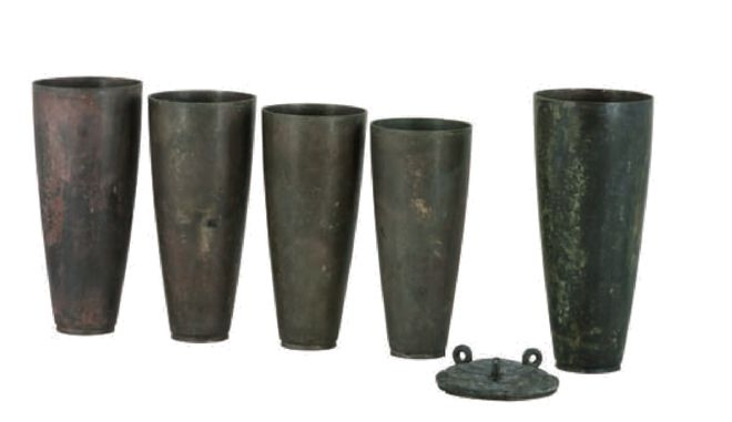 水晶杯的兄弟姐妹——战国青铜套杯 战国(公元前475年-公元前221年) 通高12.7至16.55厘米,口径5.5至6.4厘米,最大底径3.5厘米 2002年湖北枣阳九连墩1号墓出土 湖北省博物馆藏