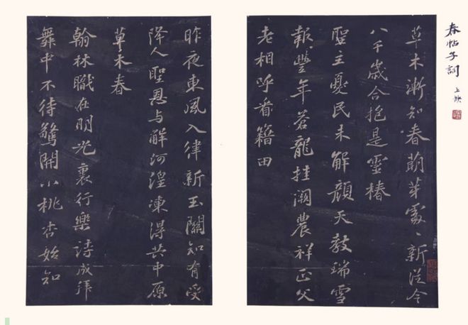 展出的宋拓群玉堂苏帖册为《群玉堂帖》第六卷,又称《宋拓群玉堂苏帖》。内容为《上清储祥宫碑》和《春帖子词》及苏轼题记,共38页,为苏轼元祐年间书作。卷内有“范大澈印”“延禧私印”“介如鉴赏”等鉴藏印,纸尾有近人张伯英题跋考证二则。墨拓保存较完好,字迹清晰,神完气足。