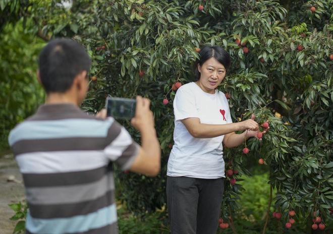 7月30日,重庆市涪陵区南沱镇睦和村村民汪登荣在荔枝园内拍摄短视频推介当地荔枝。