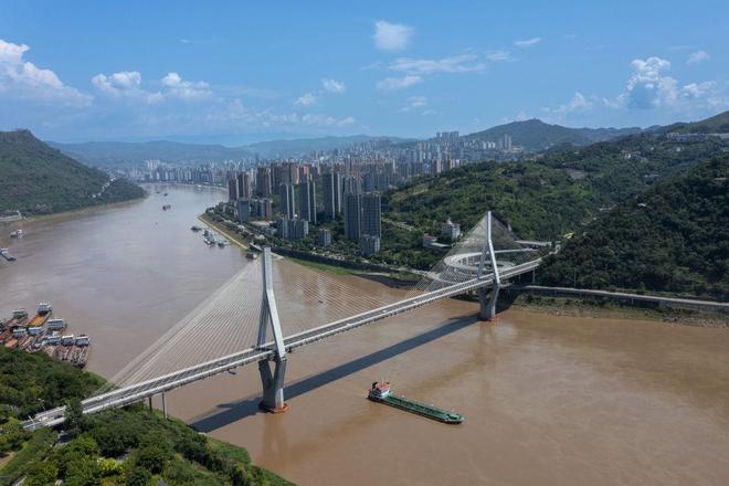 7月30日,一艘在长江上航行的货轮从重庆市涪陵区涪陵长江大桥下穿过(无人机照片)。