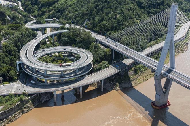 这是7月30日拍摄的重庆市涪陵区涪陵长江大桥桥头的公路立体交通(无人机照片)。