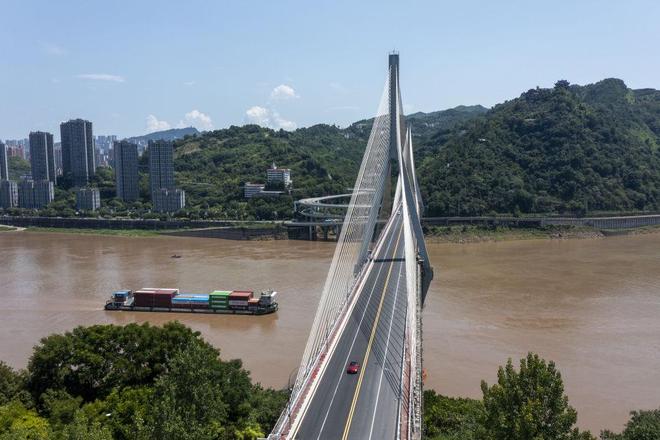 7月30日,一艘在长江上航行的集装箱货轮准备从重庆市涪陵区涪陵长江大桥下穿过(无人机照片)。
