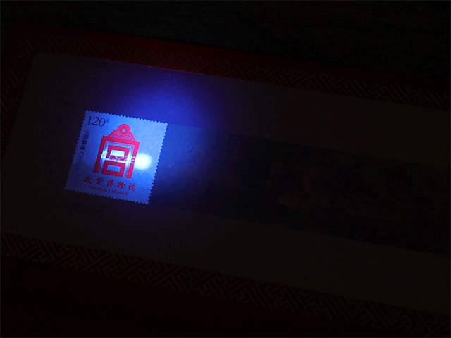 紫光灯照射下查看邮票防伪码