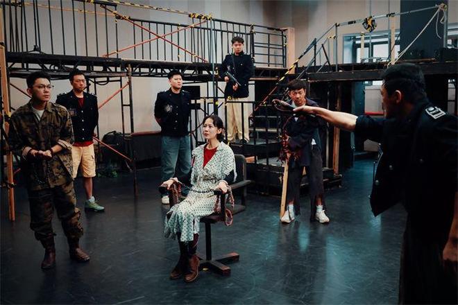 排练场也搭建起了临时的二层空间,通过海清、邢佳栋、查文浩等人的片段展示,直面萨特所提出的抉择命题以及人性深渊。出演其中层次充沛又内心丰富的复杂角色——抵抗运动队员吕茜的便是海清,挑战这个正义受到打击,忠诚受到挑战,纯洁受到玷污,自尊被激发出来了的压抑角色,海清哪怕后背面对观众时也带着戏,虽只是代用服装,上面的血迹却清晰可见,单薄的身体爆发出巨大的能量,将成为“英雄”还是成为“懦夫”的瞬间抉择题抛给观众。