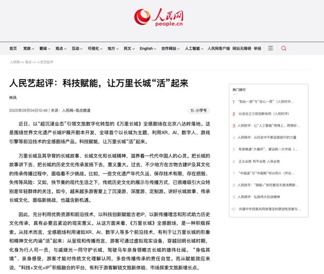 人民网点评指出,“科技赋能,让万里长城‘活’起来”,充分肯定了项目在文化传承与科技融合方面的实践意义。评论认为,长城及其文化精神是中华民族的重要精神符号,《万里长城》全感剧场通过沉浸式互动体验,将传统文化以年轻化、参与感强的形式呈现,不仅丰富了游客的文化体验,也为文旅产业数字化转型提供了可借鉴模式。