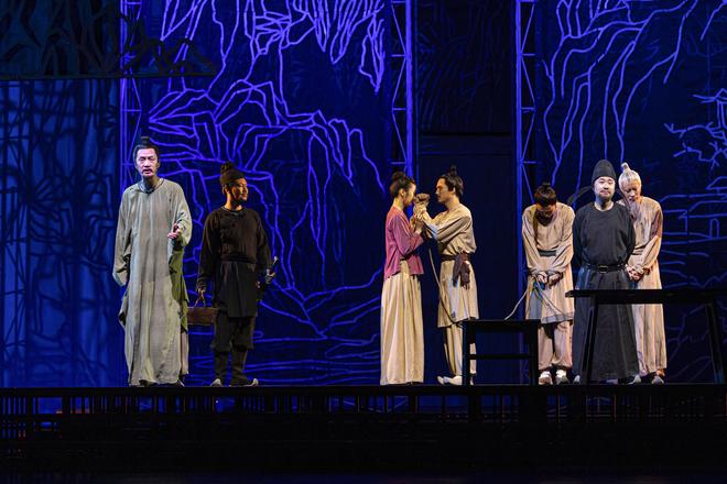 此外,现代感的舞美设计带来新意。钢铁浇铸的背景架构在幕间旋转出光影的无穷变化,营造出或是竹林山水、或是行舟江上、或是做客家宴等多重景象。金属质感的线条框架作为舞美主体,不但创造出“人在画中走、诗中游”的写意空间,也营造了刚柔相济的中国传统意境。