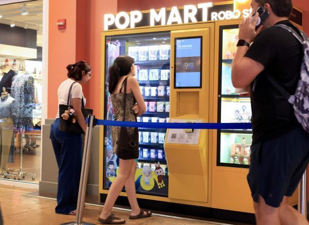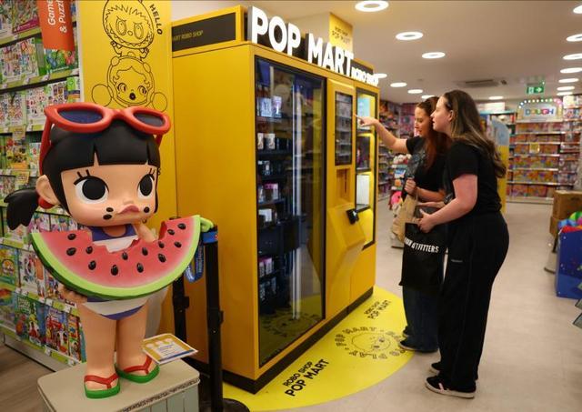 8月22日,在英国达特福德蓝水购物中心,顾客在浏览泡泡玛特机器人商店中的商品。(图片来源:路透社)