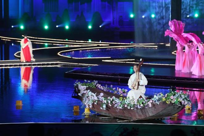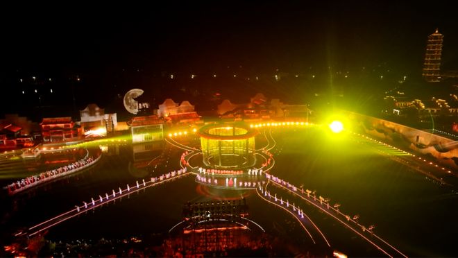 整场演出依托实景舞台,巧妙融汇水景、园林等自然意象,营造出“人入画中、戏在景中”的沉浸氛围。灯光与舞美亦取法写意美学,将传统意蕴融入现代视觉语言,构筑出虚实交融、中西合璧的诗意空间。