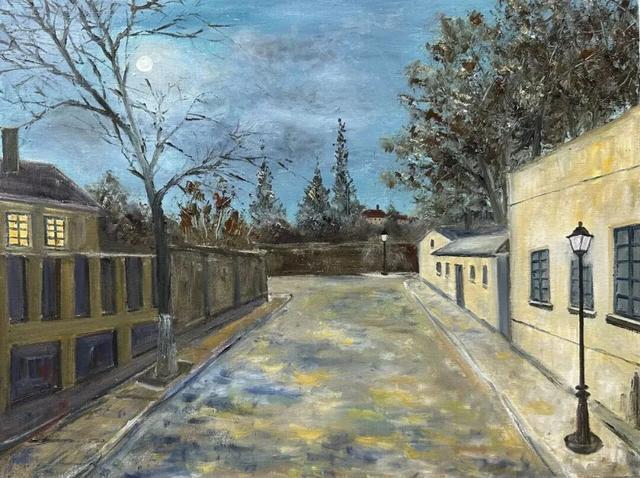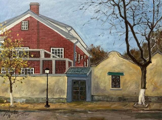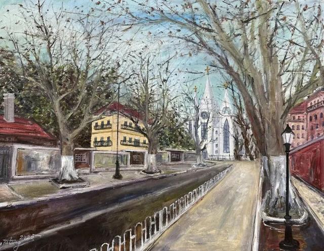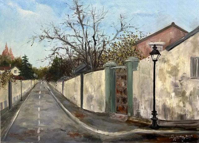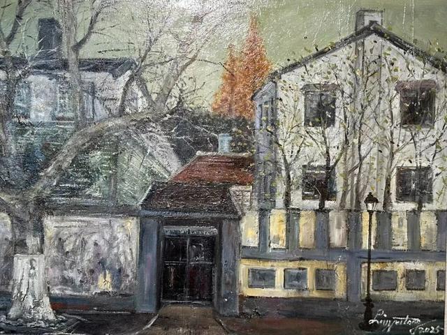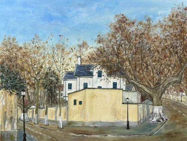 2023年9月,刘伟冬到艺术之乡巴黎小住。彼时阳光明媚,秋高气爽已在树梢凝结,一簇簇金黄和绛红色的树叶,悄然潜伏在绿荫怀抱。他踏着落叶缤纷的石板路走进奥赛美术馆,再度邂逅二十年前就一见倾心的巴黎画派的莫里斯·郁特里罗。旅行回国后他便带着郁特里罗描绘巴黎的目光书写南京的颐和路:“梧桐叶已尽数凋落,粗壮的树干根部被花木师傅涂上了白色石灰,素色中透着光的痕迹。院子里的杨树尚存星星点点的黄,远处松柏则晕染出暖橘色,为凋敝的深秋平添温度。”画家笔锋倒立,痛快淋漓,如孩童般肆意。倏然两年时光,他疯狂地画了六十多件《颐和路街景》系列作品,对日常街巷的凝视在这里化为些许追忆似水年华般的忧伤,时光被凝固,记忆被物化,色彩被交响。他的“颐和路”的宁静与郁特里罗“蒙马特街道”的孤寂隔空对话,老男人怀旧的情绪发散在梧桐树间。他试图叙说在都市空间中的存在状态与情感归属,主观与客观、历史与当下,永远不停地交织共鸣,为每个时代的亲历者筑起多重通往集体记忆与个人情愫的幽径。