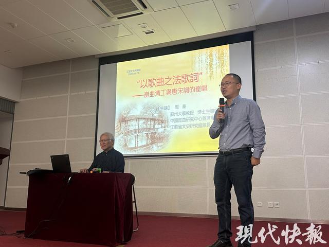 9月23日下午4:15,周秦教授又现身南京大学仙林校区文学院,开启了一场题为《“以歌曲之法歌词”——昆曲清工与唐宋词的昆唱》的专题讲座。开场时,他说:“昨天我在南京大学苏州校区给6个工学院的学生讲江南文化,昆曲是第一课,我还邀请了朋友们陆续上园林、古琴、工艺美术课等。我们已经坚持第三个学年了,我每年上一次。今天来文学院讲的专题是江苏省文史研究馆、南京大学昆曲传承发展研究中心联合主办的江苏文史大讲堂系列之一。这个主题对学习古典文学的学生来说特别有意义。”